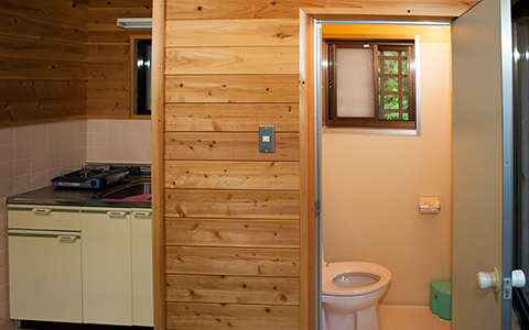 コテージには水洗トイレとキッチン、カセットコンロがついています。