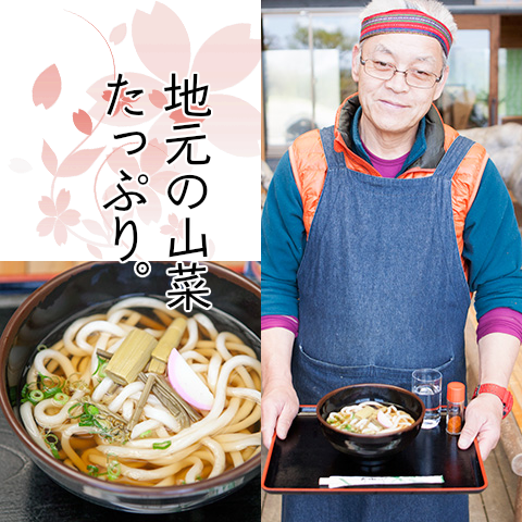 イタドリやゼンマイ、ワラビ…。豊かな自然が香る季節の山菜をトッピングした、特製うどんを召し上がれ。季節によって、トッピングの内容は変わります。