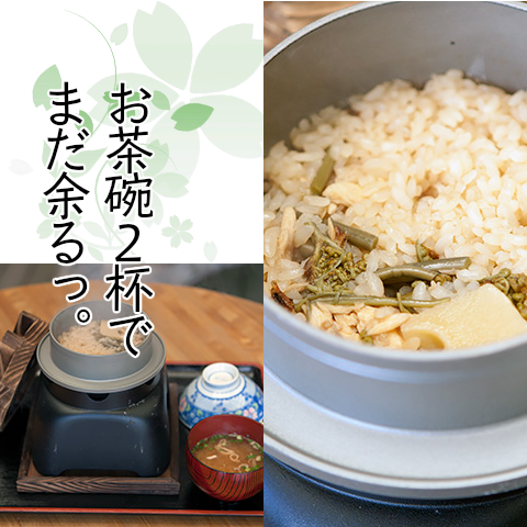清流の女王と呼ばれる川魚あめご(アマゴ)と山菜の釜飯はいかがだろうか。山と川の滋味をしっかり染みさせて、ひと釜ずつ炊きあげる山のもてなし。お茶碗にてんこ盛りにして、2杯分。お味噌汁もついてますが、何か(^^?